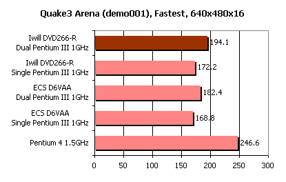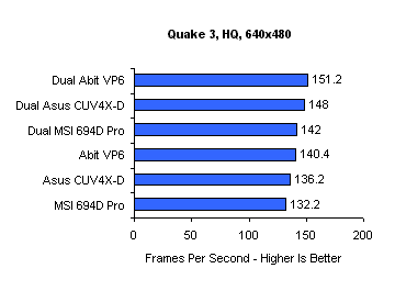 Firingsquad fandt følgende fordel ved dual cpu: Abit 8% ekstra ydelse, Asus 9% ekstra ydelse og MSI 7% ekstra ydelse. Så Iwill på Xbitlabs fører med sine 13% og generelt må vi konkludere, at dual cpu gør din computer ca. 9% hurtigere i Quake 3 Arena, når opløsningen er lav. Ved højere opløsninger, hvor GeForce2 grafikkortet bliver flaskehals, ser vi noget meget overraskende: