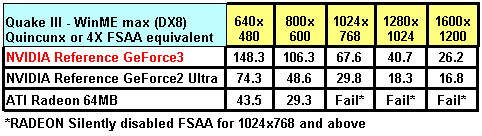 Med FSAA og Q3A i MAX-opsætning er 1024x768x32bit stadig en acceptabel opløsning med GeForce3, som her er over 100% hurtigere end GeForce2 Ultra. Endvidere er Radeon helt stået af i denne opløsning. Så mens GeForce2 Ultra kun yder acceptabelt i 640x480 med 4xFSAA, så kan kommende GeForce3-ejere se frem til at nyde 1024x768x32bit med Quincunx (svarer til 4xFSAA). NVNews fandt i HIGH QUALITY (ikke MAX) med FSAA: