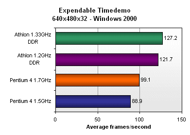 Expendable er et gammel DirectX6.0-spil, som heller ikke udnytter P4's arkitektur. Dette forklarer, hvorfor Athlon 1,33 GHz + DDR-ram er 28% hurtigere end P4 1,7 GHz.