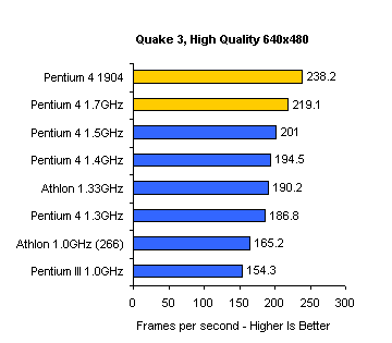 FiringSquad finder, at P4 1,7 GHz er 20% hurtigere end Athlon 1,33 GHz. Vi har ikke medbragt resultater fra TomsHardware og Anandtech, da TomsHardware ikke testede Q3A i HQ i 640x480, og da Anandtech kun testede Q3A i 1024x768 opløsning.