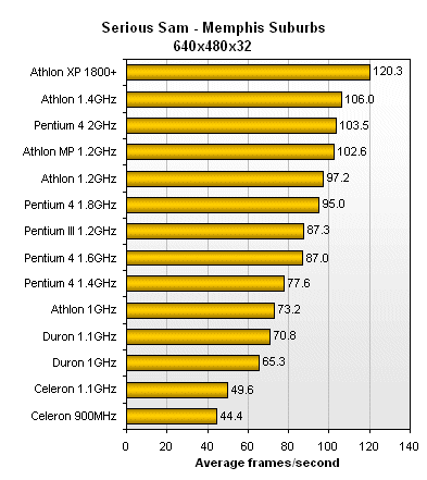 ExtremeTech er ikke i tvivl om, at P4 2 GHz er langt hurtigere til Q3A end Athlon XP 1800+. P4 2 GHz er her 24% hurtigere end Athlon XP 1800+. Så Pentium4 vinder Quake3 Arena testen, selv om Athlon XP 1800+ er meget tæt på, når KT266A bundkort anvendes (jvf. Anandtechs resultater). Vi fortsætter med Serious Sam: