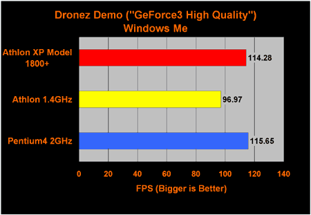 Takket være AMD760-bundkort, lykkedes det med nød og næppe for P4 2GHz at vinde i Dronez. Forskellen er dog kun 1%, og med KT266A bundkort ville Athlon XP 1800+ med al sandsynlighed have vundet stort.