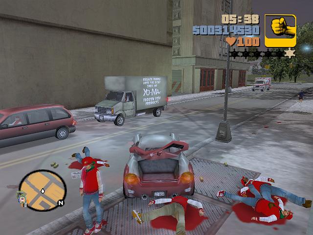 Ovenstående billeder illustrerer, at GTA3 ikke er for de mindste. Dog er spillet ikke helt på højde med Soldier of Fortune 2, grundet den ringere grafik i GTA3, men GTA3 kommer vel ind på en flot anden plads. Via diverse våben som håndgranater, maskingevær, pistoler, flammekaster, bazooka mm. kan vold og drab udøves på omfattende måder.