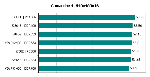 Dungeon Siege er fremfor alt cpu-afhængigt, og ram-system (båndbredde) betyder stort set intet. Forskellen på i850E + PC1066 og SIS648 + PC3200 er under 1%, mens P4X400 her kun er ca. 2% bagefter i850E. Vi slutter af med Comanche4: