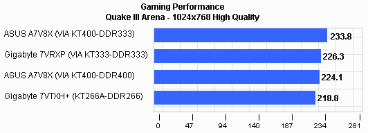 Bemærk, at Anandtech benyttede Athlon XP 2000+ cpu, mens Tom's Hardware, GamePC og OCWorkBench benyttede hhv. 2600+, 2100+ og 1500+. Alle pånær OCWorkBench benyttede GeForce4 Ti 4600 grafikkort, OCWorkBench benyttede Geforce3 Ti 200. Tom's Hardware benyttede helt nye bios-udgivelser (bl.a. bios til Asus KT400 fra 2. september 2002), så resultater fra Tom's Hardware bør vægtes specielt højt (kun Tom's Hardware oplyste biosversioner på testede bundkort - det er uvist om andre sites benyttede nyeste biosversioner). Vi starter med Quake3 Arena: