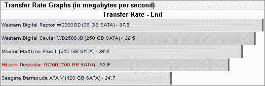 Hos Storagereview er Hitachi også vinderen, og Hitachi er 13% og 17% hurtigere end hhv. Maxtor og WD. Så Hitachi 7K250 klarer sig aldeles fremragende mht. søgetid, men lad os se, hvorledes det går i en af de vigtigste kategorier, nemlig overførselsrate: