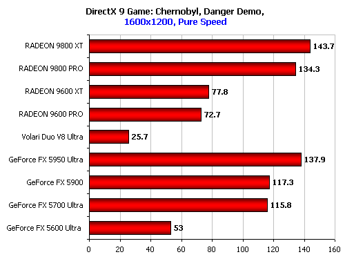 Ydelsen reduceres kraftigt med 4xFSAA og 8xANI. Radeon 9800XT er nu hele 31% hurtigere end GeForceFX 5950 Ultra. Resultater fra XGI mangler mht. 4xFSAA + 8xANI, fordi Volari Duo V8 Ultra grafikkortet med nyeste drivere ikke virkede med anisotropisk filtrering. XBitLabs har dog inkluderet testresutlater fra 3 demoer, så vi fortsætter: