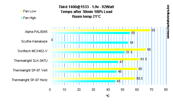 Test-cpu'en er en gammel Athlon Thunderbird på 1,4 GHz, der er overclocket til 1,53 GHz. Blæseren larmer i "low" kun 19 dBA og tilfører 24 CFM (CFM = Cubic Feet per Minuter, dvs. "kubik-fod" luft i munuttet), hvilket f.eks. svarer til 19 dBA 80mm Pabst-blæser. Madshrimps påstår, at denne overclockede cpu afgiver 92 watt, hvorved den burde være glimrende til at teste køleevnen på diverse køleprofiler. Den store vinder er Thermalright SP-97, og det er dog også sandsynligt, at tilsvarende temperaturforskelle mht. diverse køleprofiler vil gælde for en Palomino, Thoroughbred eller Barton cpu.