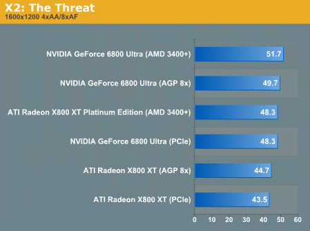 Hos Anandtech vandt AGP8x over PCI Express x16 mht. både Radeon X800XT og GeForce 6800 Ultra; dvs. AGP8x var 2-4% hurtigere end PCI Express x16. Lad os se, om Firingsquad er enige: