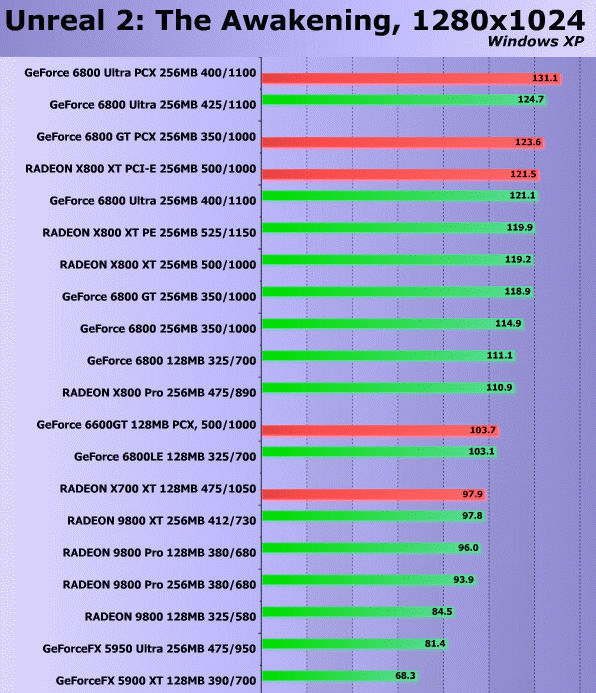 Nvidia dominerer her med hård hånd og giver fortsat storsmæk til X800XT (PE) og X800Pro. X800XT PE yder dårligere end GeForce 6800, men koster ca. det dobbelte. X800Pro er langt bagefter GeForce 6800 og taber endda markant til 6600GT. GeForceFX 5950 Ultra taber formodentlig grundet Catalyst 4,11B til 9800XT, og tilsvarende gælder mht. 9800Pro og 5900XT.