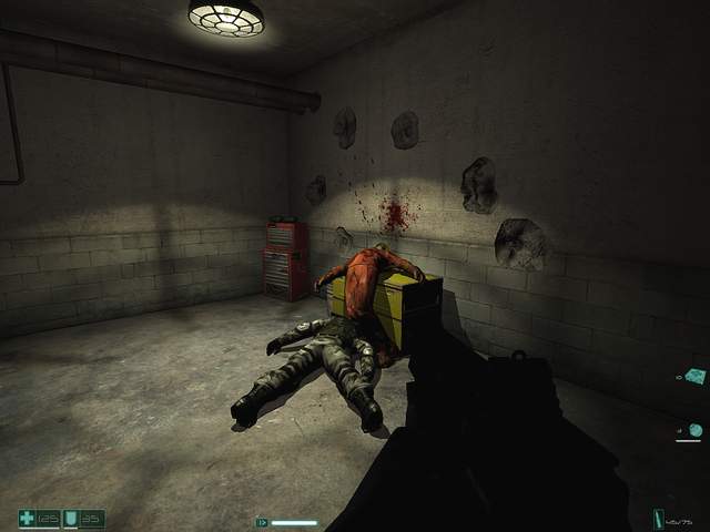 Venstre ben er sprængt af ved knæet - bemærk det åbne sår. FEAR er således et af de hidtil mest blodige og voldelige spil