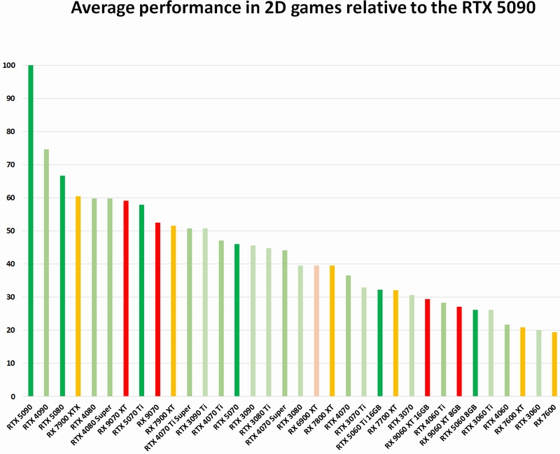 Farvekoder: Grøn = Nvidia serie 50 (RTX 5090, 5080, 5070 og 5060), lysegrøn = Nvidia serier 30 og 40. Rød = AMD serie 9000, orange/lyserød = AMD serier 6000 og 7000.