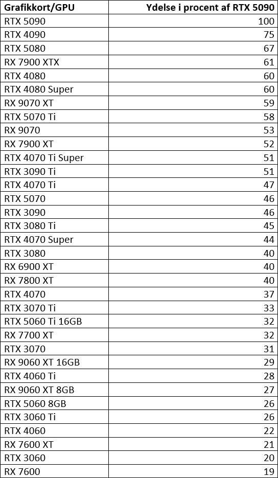 Vi har omregnet ydelse med de forskellige grafikkort, så RTX 5090 sættes til 100% i alle spil, og så skaleres de øvrige grafikkort ifht. RTX 5090. Her er resultaterne fra forringe billede i en tabel: