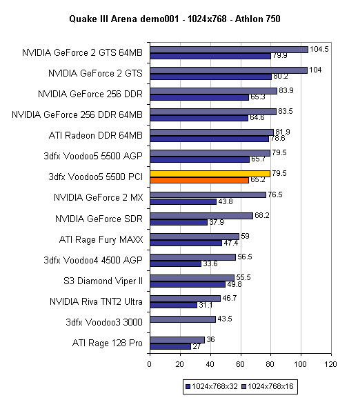 Men hvem undrer det? Voodoo5 5500 understøtter ingen AGP-features, så det ville netop undre, hvis V5 5500 AGP var HURTIGERE end PCI-versionen. Eneste fordel ved v5 5500 AGP er, at AGP fodres med 66MHz, mens PCI får 33Mhz, og det betyder åbenbart intet.