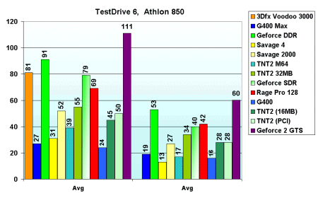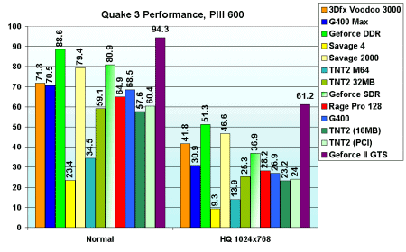 Voodoo3 stadig meget hurtigere end TNT2 Ultra 32MB og hurtigere end selv GeForce SDR (men kan dog ikke være med i 32bit farver). Matrox G400 (inkl. max) snupper bundplaceringen...